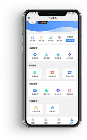 运营管理人员实现分销管理、设备管理、充电卡管理、订单管理、财务管理,运营数据统计查看,实现管理高效、实时监控财务数据。
